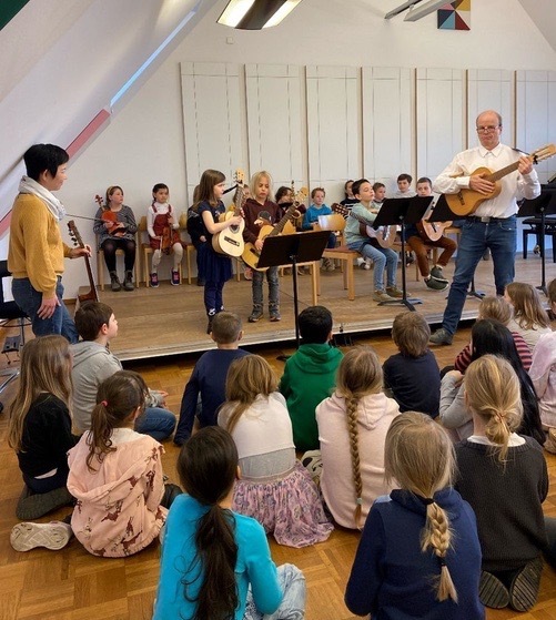 Gleich nach den Osterferien vom 17. – 21. April fand an der Grundschule Großostheim die Musikwoche statt, eine ganz besondere Aktion in Kooperation mit der Musikschule Großostheim. Von Montag bis Donnerstag waren jeweils die Kinder und Klassenlehrerinnen einer Jahrgangsstufe in die Räume der Musikschule eingeladen, wo an jedem Tag von ausgebildeten Instrumentallehrern ein anderes Instrument vorgestellt wurde. Zum Abschluss der Woche fanden am Freitag in den Räumen der Musikschule zwei kleine, von Instrumentalschülern gestaltete Konzerte statt, zu denen neben den Schülerinnen und Schülern der Grundschule auch deren Eltern eingeladen waren. Dabei zeigte sich das breit gestreute Interesse der kleinen Instrumentalisten an der Vielfalt der Instrumente. Es spielten Adam Heda (1a), Lucia Bode (1b), Alexander Rollinger (1b), Henri Huggenberger (2c), Sophia Balauras (4b) und Ester Borella (4c) auf der Girarre, Greta-Marie Becker (3a) auf der Blockflöte, Lara Gries (3a) auf der Querflöte, Stefanie Xie (3b), Darina Szierzen (4b) und Helene Rollmann (4c) auf der Violine, Luisa Lafrenz (3c) am Cello, Mina Schrod (3c), Max Julius (3c) und Jannis Prentner (4a) am Klavier, Jakob Lindenborn (4b) und Valentin Seefried (4b) auf der Trompete und Sophie Einert (4c) auf dem Saxophon. Auch die Singklassenschüler traten unter der Leitung von Theresa Zänglein auf und boten zwei Gesangsstücke zum Mitmachen dar. Die beiden Leitungen der Grundschule Großostheim, Simone Remmers, und der Musikschule Großostheim, Bernd Nonnweiler, legen großen Wert auf enge Zusammenarbeit, um die musikalische Bildung der Kinder bestmöglich zu fördern. Die Musikwoche ist ein Baustein der Kooperation und auch für nächstes Schuljahr bereits fest vorgesehen.