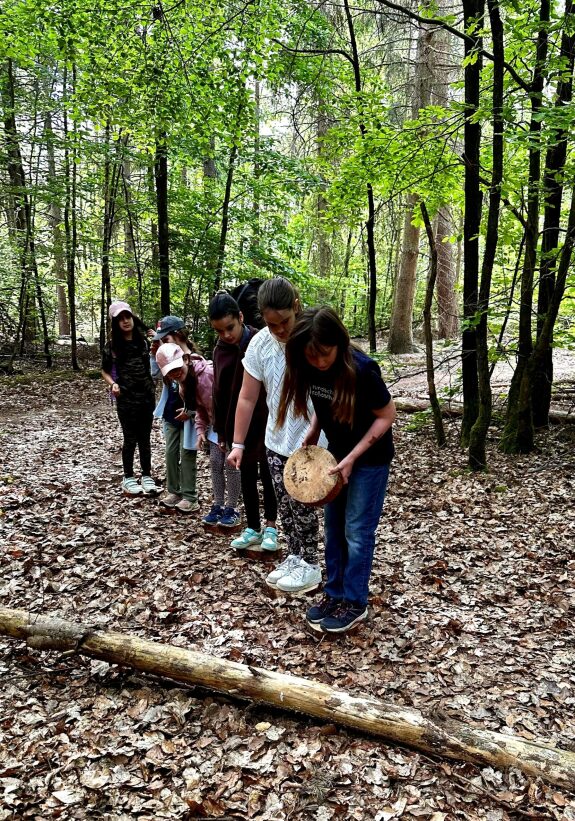In Gruppen eingeteilt mussten die Kinder auf einem drei Kilometer langen Rundweg im Großostheimer Unterwald „Alte Häge“ an vier Stationen ihr Wissen und Können unter Beweis stellen: mit Adleraugen entlang eines Pfades versteckten Müll erspähen oder gemeinsam viele interessante Fragen anhand der Informationstafeln eines Baumlehrpfads beantworten. Sportlich ging es zu an der Station „Moorüberquerung“, bei der ein 15m langes Feld (Moor) mit Hilfe von Baumscheiben von der ganzen Gruppe überquert werden musste. Schließlich gestalteten die Kinder mit Naturmaterialien, die sie im Wald gesucht hatten, ein gemeinschaftliches Bodenbild. Der Kreativität waren keine Grenzen gesetzt und es entstanden wunderschöne Werke.